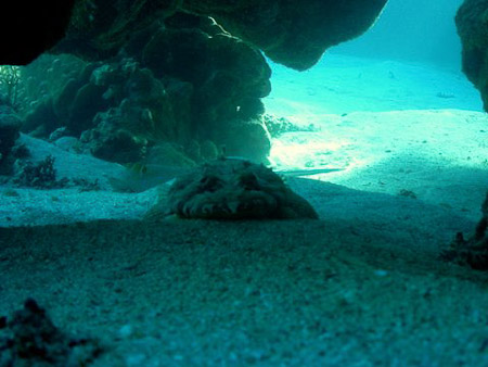 Teppich-Krokodilfisch mit Blaupunkt-Stechrochen